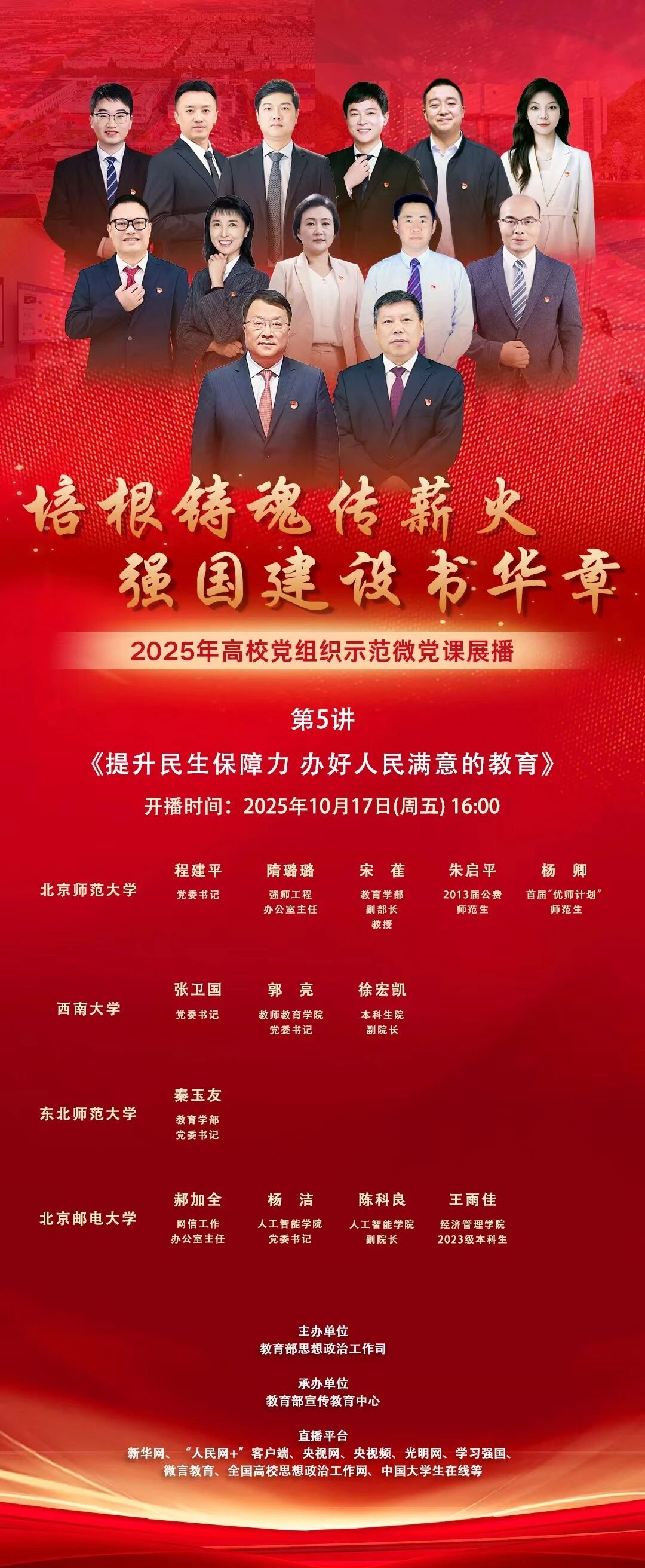 2025年高校党组织示范微党课于今天下午播出。本期跟随北京师范大学、西南大学、东北师范大学、北京邮电大学师生党员,走进“培根铸魂传薪火,强国建设书华章”主题第5讲《提升民生保障力 办好人民满意的教育》,内容聚焦“民生保障力”,呈现高校在优化资源配置、推进教育公平、服务国家教育数字化战略中的积极作为,充分体现教育的人民属性,以教育为民的实际行动,诠释办好人民满意的教育的初心与使命,展现以人民为中心推进教育强国建设的生动实践。请结合实际组织校内师生学习收看,并做好观看记录。